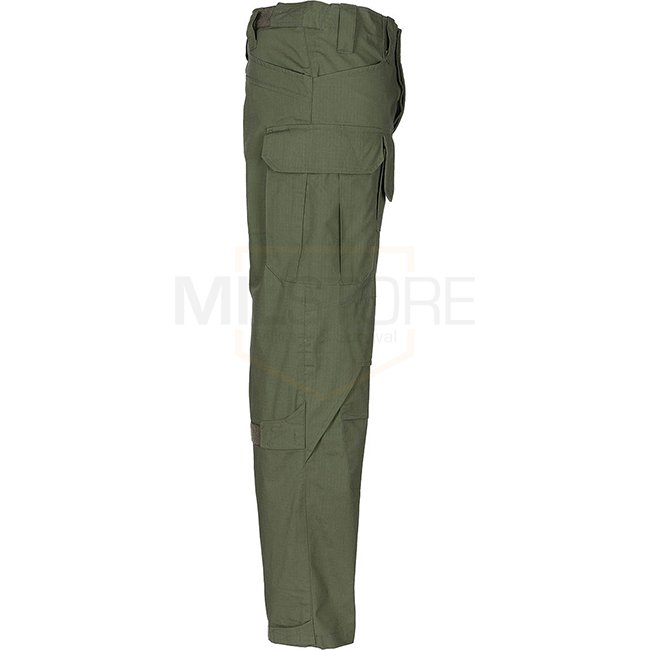 Pantalon de combat MFHHighDefence MISSION en Olive - S avec braguette à boutons, 2 poches avant et arrière, bretelles extra longues, 2 poches pour jambes avec rabat, poches pour protège-genoux, parties de genoux ajustables, ceinture et ourlet inférieur av