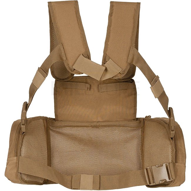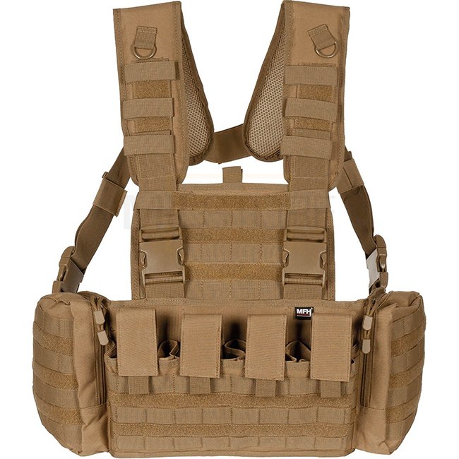 Gilet de combat tactique léger, MFHProfessional Mission Chest Rig - Coyote : équipé d'un système modulaire, adapté pour une gourde US d'1 litre, poids environ 1,2 kg.