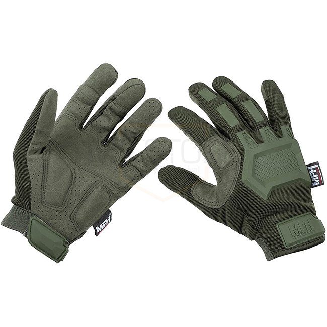 Gants tactiques professionnels MFH Action - Olive - M : Respirants, à séchage rapide, avec rembourrage et renfort. Excellente adhérence, propriétés tactiles. Doigts souples, protection des articulations pour la mobilité. Bracelets ajustables. Matériau : 8