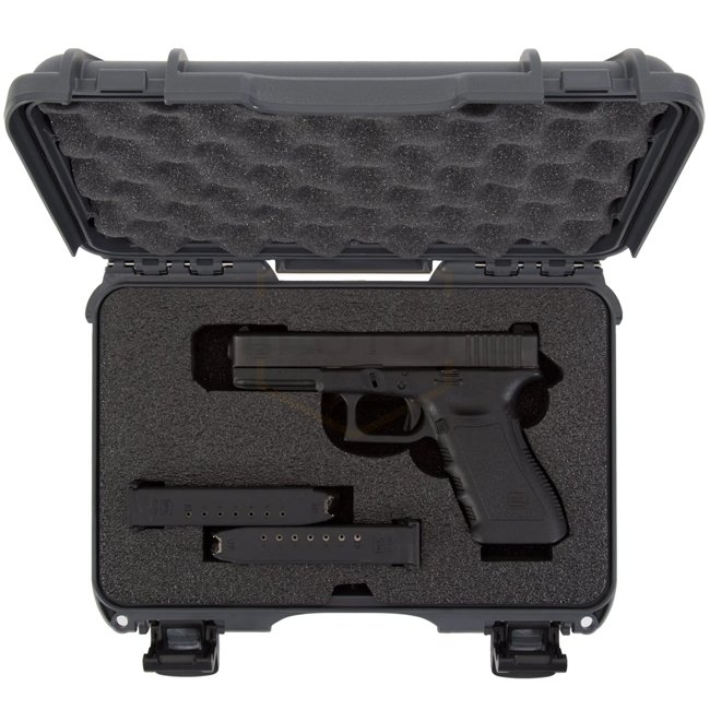 Boîtier robuste en résine NK-7 avec fermetures PowerClaw et soupape d’égalisation automatique. L’édition Glock comprend un insert en mousse à cellules fermées prédécoupé pour 1 pistolet et des chargeurs, pour un transport sûr et ordonné.