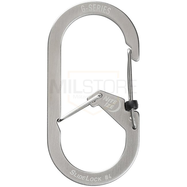 Nite Ize G-Series SlideLock #4 - Argent. Construction en acier inoxydable avec une fonction SlideLock pour une sécurité accrue. Léger et compact avec des dimensions de 38 x 76 x 6,5 mm, 25 g. AVERTISSEMENT : Ne convient pas à l'escalade ou dans des situat