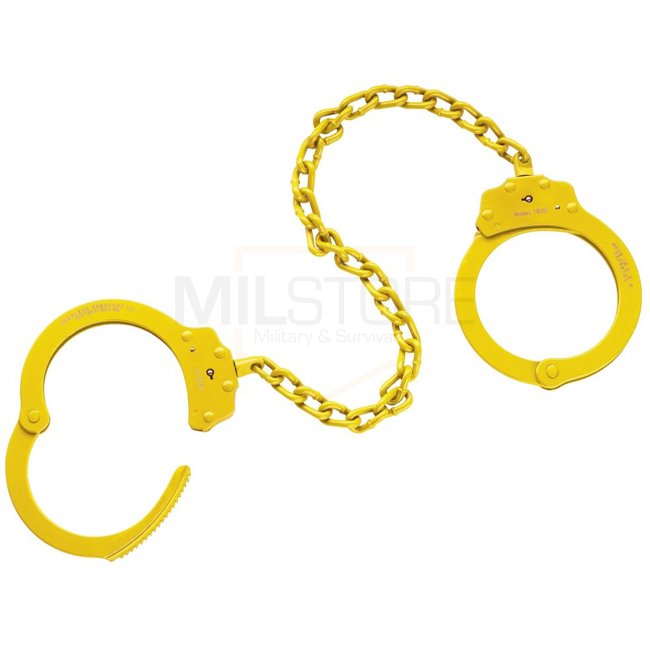 Modèle Peerless 753C Menottes pour jambes - Jaune : Construction tout acier avec mécanisme de verrouillage interne amélioré. Conforme aux normes NIJ avec un revêtement EPP durable. Chaîne de 38 cm limitant l'amplitude des mouvements. Garantie à vie, fabri