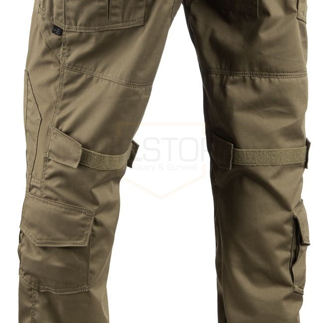 Les poches sur les cuisses volontairement placées vers l'avant, accessibles également en position assise grâce à de larges ouvertures et des fermetures éclair verticales, ainsi que des poches de communication à double renfort placées juste à côté, accueillent le matériel fréquemment utilisé. Les poches principales peuvent également être fermées avec un gros bouton, avec du velcro ou les deux à la fois. Les poches arrière inclinées restent accessibles même lorsque l'équipement est transporté sur une large ceinture de combat.