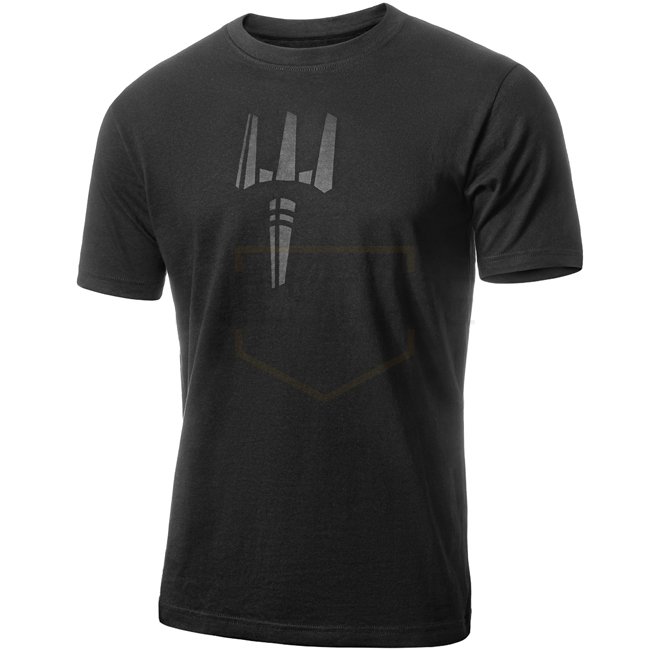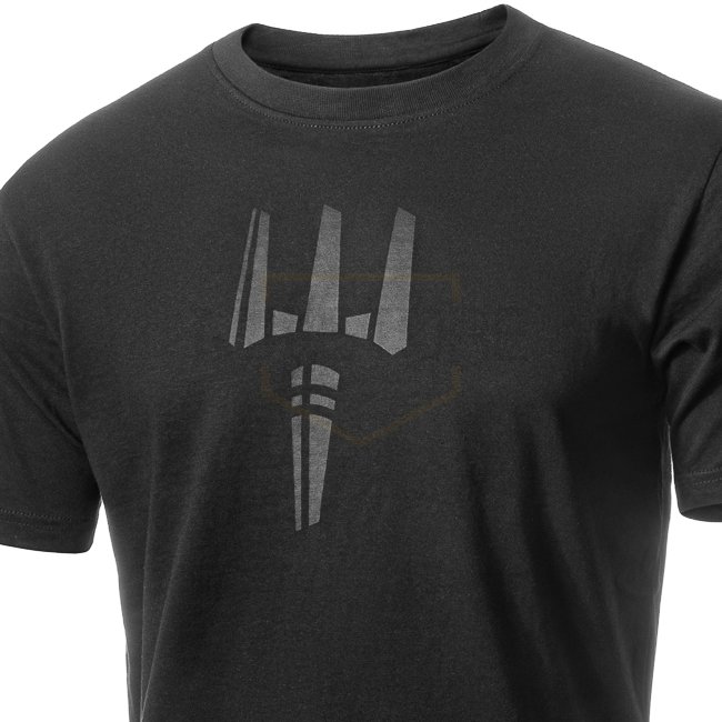 Un t-shirt décontracté et élégant avec impression de fourche en noir, présentant un grand trident à la hauteur de la poitrine et un petit logo PFS à l'ourlet arrière. Coupe semi-ajustée pour un ajustement parfait à partir d'un mélange de coton-polyester 5