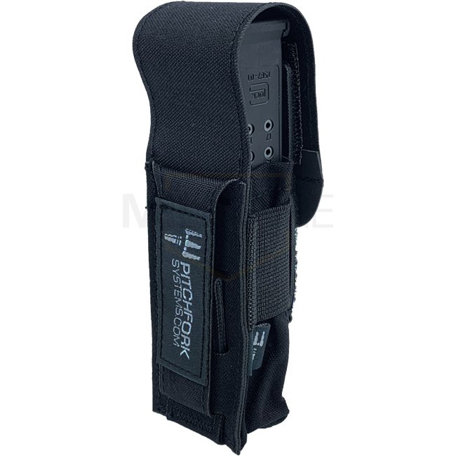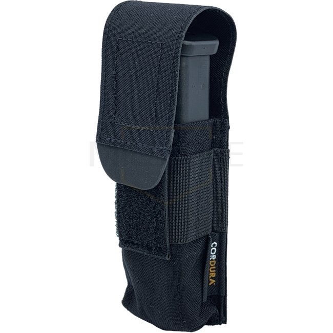 La Closed Single Pistol Magazine Pouch peut contenir les chargeurs à pistolet double-stack habituels, même les plus larges .45 cal. chargeurs conviennent. Les chargeurs Single-Stack également s'adapter, mais ne sont pas trop serrés. Pour une meilleure prise sur le chargeur, la poche est entourée d’un élastique. La languette en Hypalon hautement résistante et légèrement élastique, simplifie l’ouverture, même lorsque vous portez des gants.
