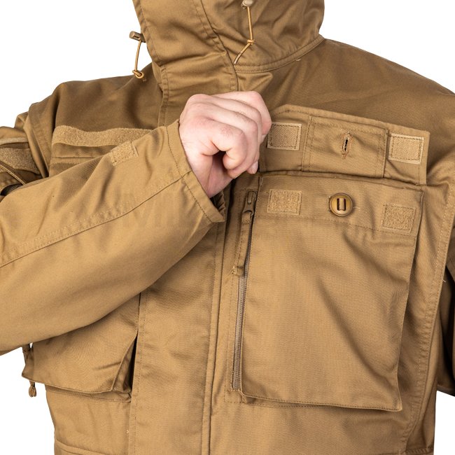 • Capuche Ajustable: La capuche peut être ajustée en circonférence et en hauteur, s’adaptant confortablement aux casques balistiques.