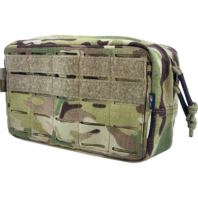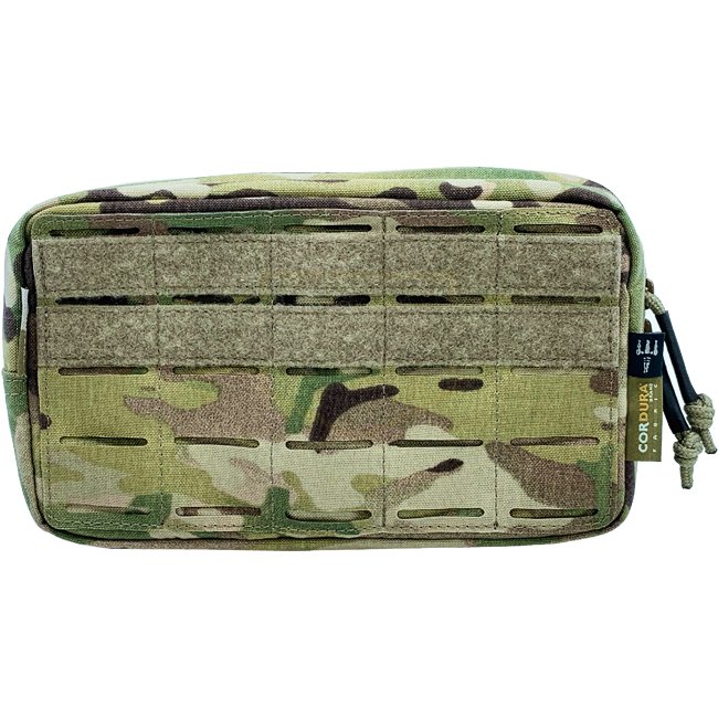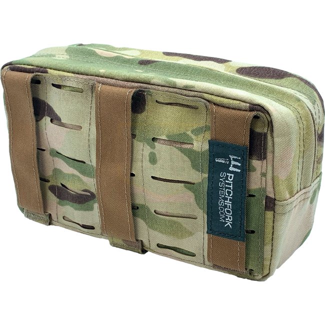 Pochette utilitaire horizontale Pitchfork Medium - Multicam : système MOLLE, patchs Velcro, boucles élastiques, poche en maille, fermeture éclair YKK, Nylon Cordura 500D. Dimensions : 70 x 130 x 200 mm.