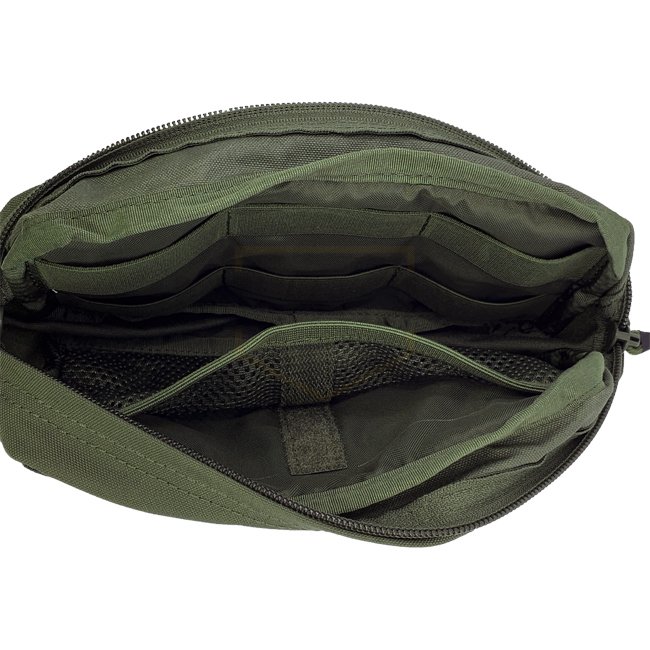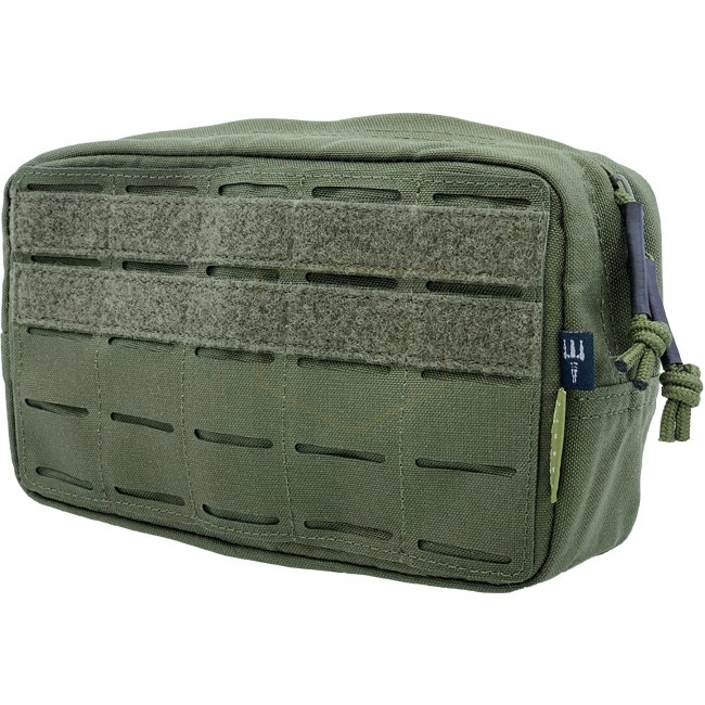 La pochette utilitaire horizontale moyenne Pitchfork - Ranger Vert dispose d'un système MOLLE, de bandes Velcro pour écussons, de boucles élastiques, et d'une poche en filet avec division Velcro. Fermeture éclair YKK durable avec languettes recouvertes de