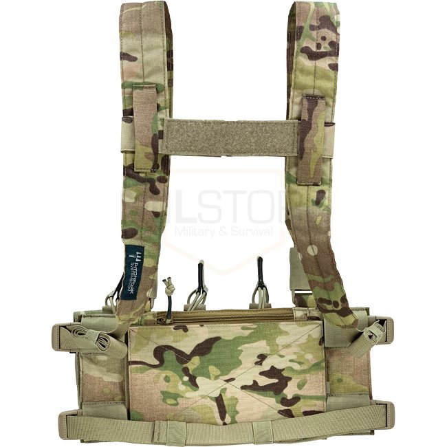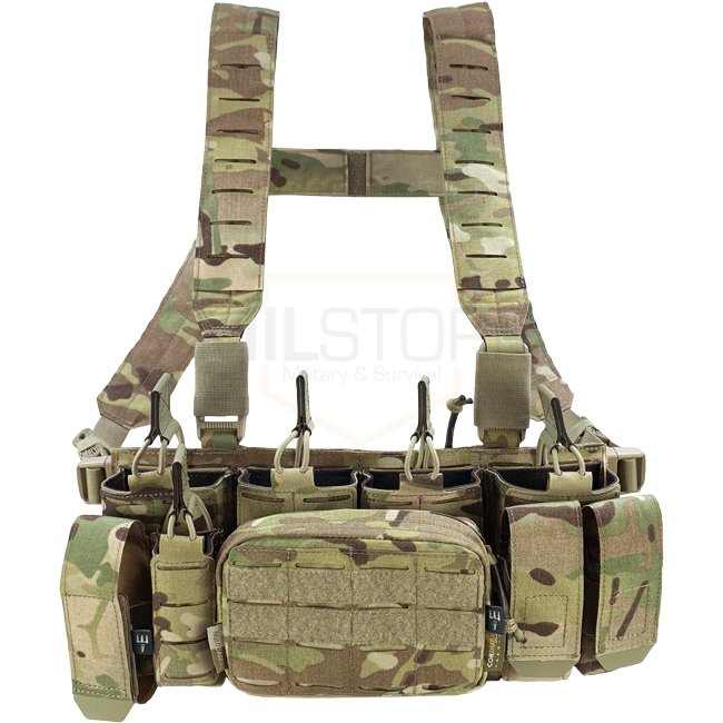 Le Pitchfork MCR Modular Chest Rig - Multicam est un gilet de combat très polyvalent, basé sur le système MOLLE, complet avec diverses poches et sangles.