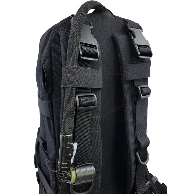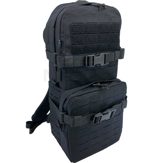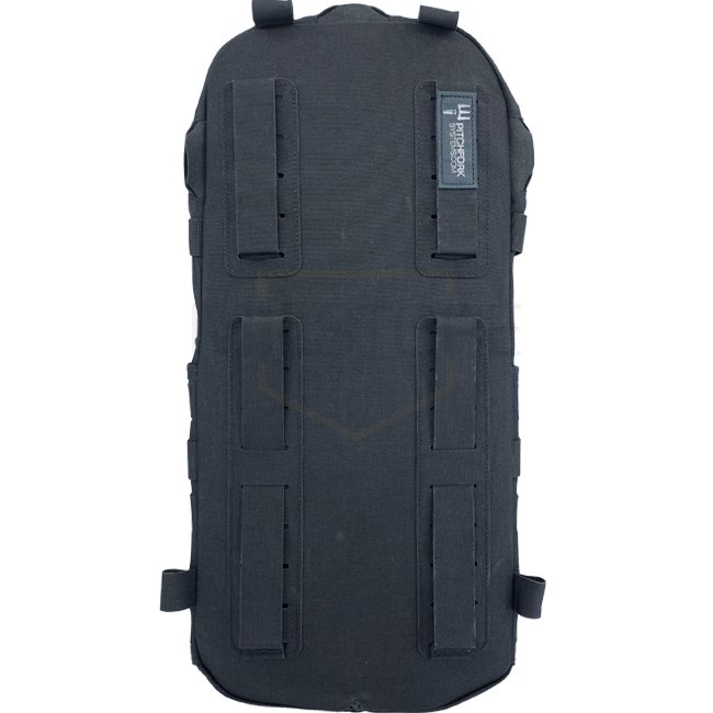 Sac de Chargement & Hydratation Medium Pitchfork - Noir : Un sac à dos polyvalent compatible avec le système MOLLE pour une personnalisation facile. Inclut des bretelles rembourrées, une sangle de poitrine ajustable, un renfort amovible et un volume total