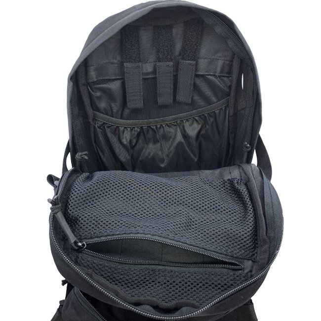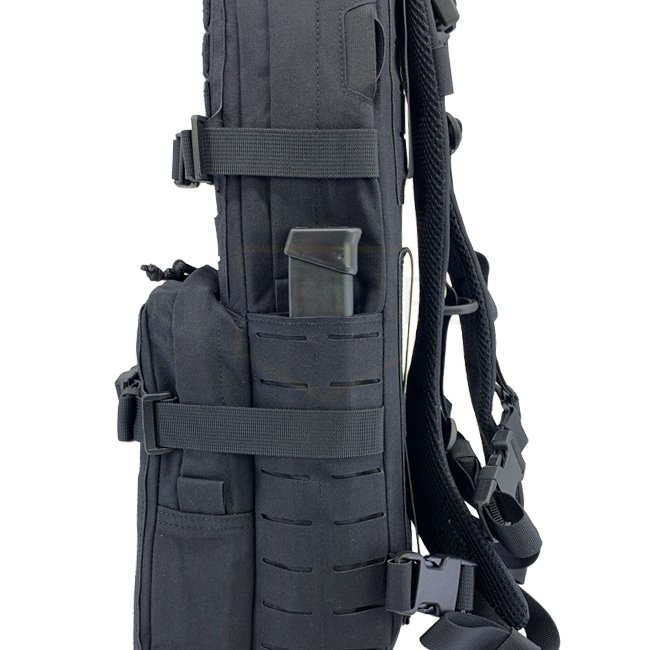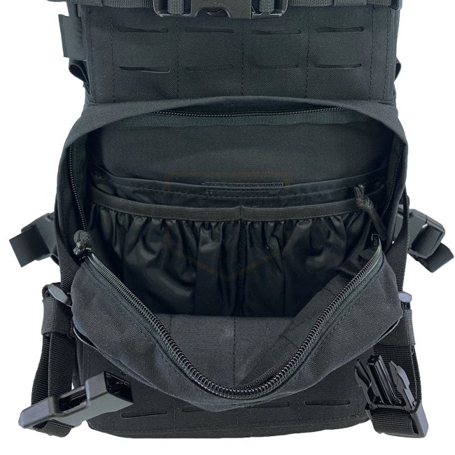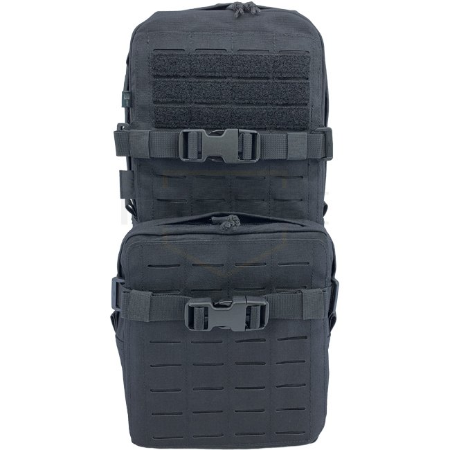 Recouvert d'une surface laminée LaserCut sur trois côtés ainsi que de zones velcro pour les patches d'identification et de moral, il comporte des compartiments longs et minces à chaque côté. Ils peuvent contenir des antennes, des câbles, des chargeurs ou des outils nécessaires. Les compartiments sont ensuite recouverts de surfaces LaserCut pour fixer des poches supplementaires à base de MOLLE.