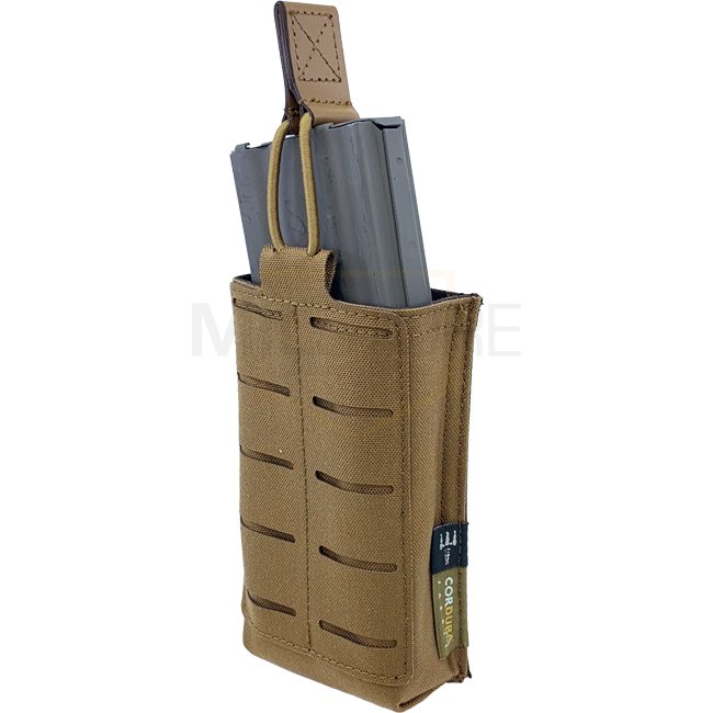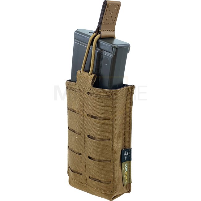Le porte-chargeur de fusil simple Pitchfork Open - Coyote peut contenir de manière sécurisée une variété de chargeurs de fusil, caractérisé par un onglet de tirage ajustable en Hypalon et un revêtement anti-dérapant pour une meilleure prise. Surface Laser