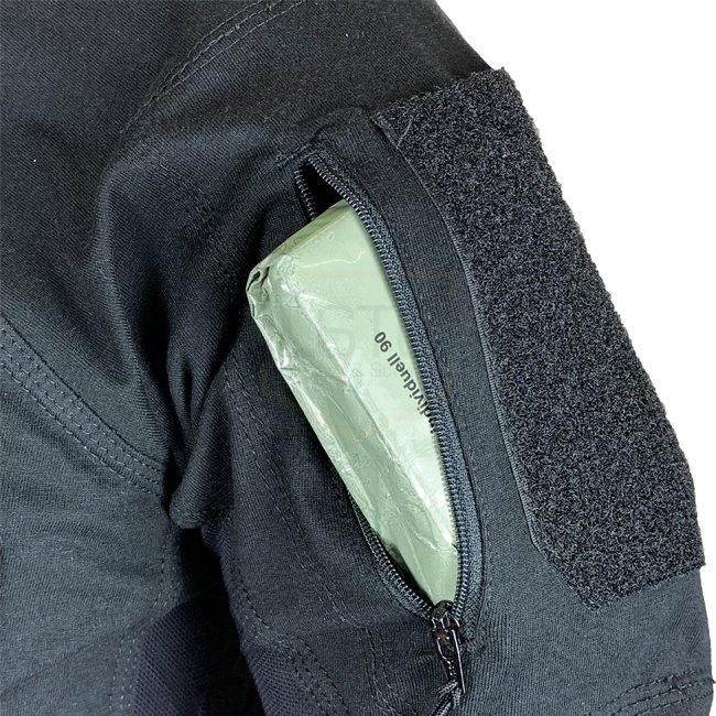 Sur les côtés et sous les bras, il est doté d'une maille légère, douce et respirante, qui assure le refroidissement nécessaire dans les situations chaudes. Sur les côtés, on trouve également des poches pour un smartphone ou d'autres objets plats. Les traversées de câbles permettent un acheminement dissimulé des écouteurs ou autres câbles. Les poches intégrées sur les bras supérieurs avec fermetures à glissière YKK ont également des entrées de câble des deux côtés. Du velcro sur les bras et sur la poitrine permet d’appliquer des patches de nom, des insignes de grade et d’autres.