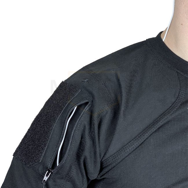 Sur les côtés et sous les bras, il est doté d'une maille légère, douce et respirante, qui assure le refroidissement nécessaire dans les situations chaudes. Sur les côtés, on trouve également des poches pour un smartphone ou d'autres objets plats. Les traversées de câbles permettent un acheminement dissimulé des écouteurs ou autres câbles. Les poches intégrées sur les bras supérieurs avec fermetures à glissière YKK ont également des entrées de câble des deux côtés. Du velcro sur les bras et sur la poitrine permet d’appliquer des patches de nom, des insignes de grade et d’autres.