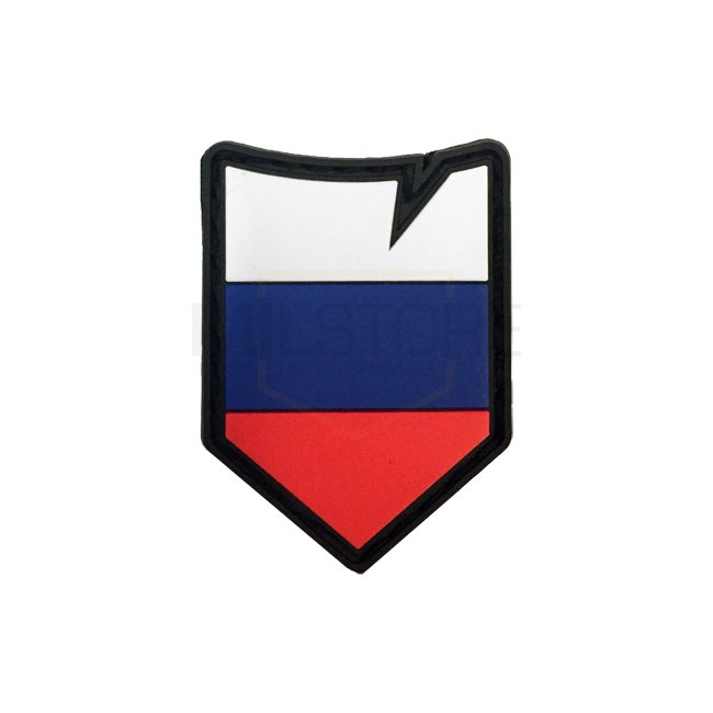 Écusson tactique Pitchfork représentant le drapeau de la Russie. Couleurs vives, construction durable. Dimensions : 37 x 45 mm. Dos velcro pour une fixation facile.