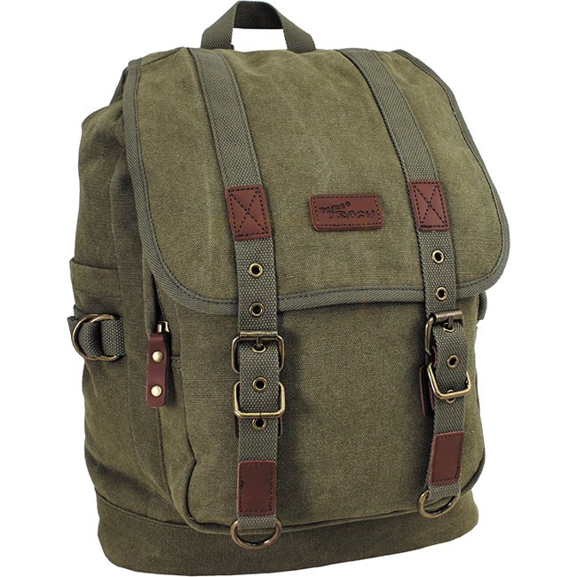 Sac à dos en toile PureTrash stylé et fonctionnel PT de couleur olive. Fabriqué en cuir véritable de haute qualité et accessoires en laiton. Présente des bretelles rembourrées et ajustables, une poignée de portage, plusieurs poches et compartiments pour u