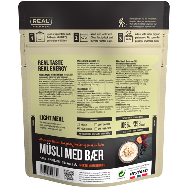 REAL Light Meal Muesli & Berries - un repas nutritif et léger préparé par une équipe de chefs qualifiés en Norvège. Approuvé par l'OTAN et privilégié par les unités militaires à travers le monde. 700 kcal par portion. Végétarien.
