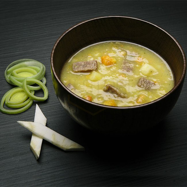 Soupe de viande REAL Turmat - 1060 kJ / 253 kcal par portion. Sans gluten, sans lactose.
