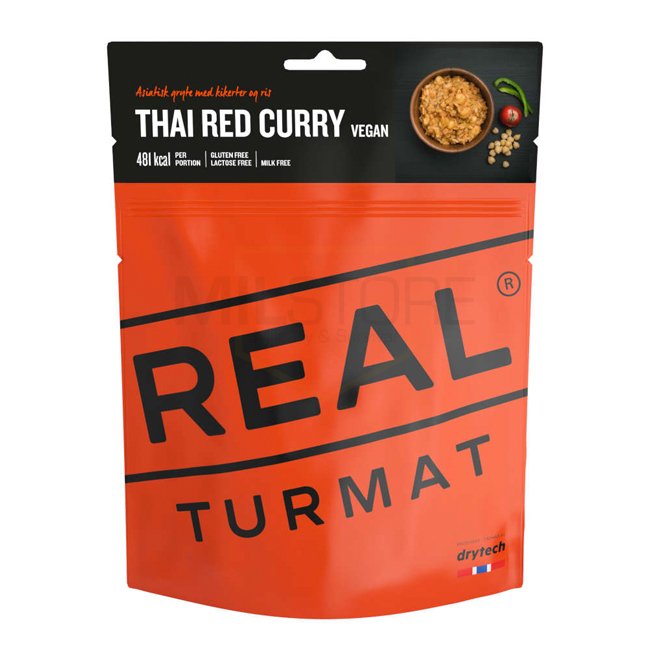 REAL Turmat Curry Rouge Thaï: Délicieux curry thaï végétarien. Sans gluten ni lactose. 2015 kJ / 481 kcal par portion.