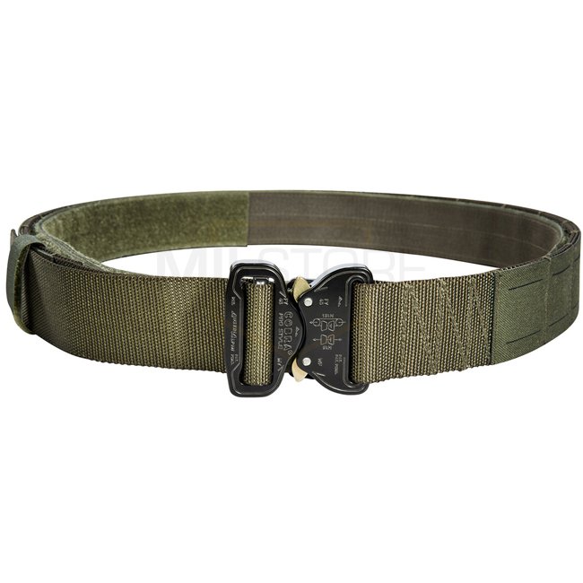 Le set de ceinture modulaire Tasmanian Tiger en Olive, taille L, comprend une ceinture extérieure et intérieure avec une boucle Cobra et est disponible en plusieurs tailles.