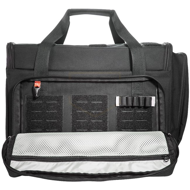Sac de Tir Modulaire Tasmanian Tiger - Noir : Sac d'entraînement modulaire pour tireurs avec séparateurs ajustables, fermetures éclair verrouillables et multiples options de rangement. Comprend une bandoulière détachable, des poignées rembourrées et un re