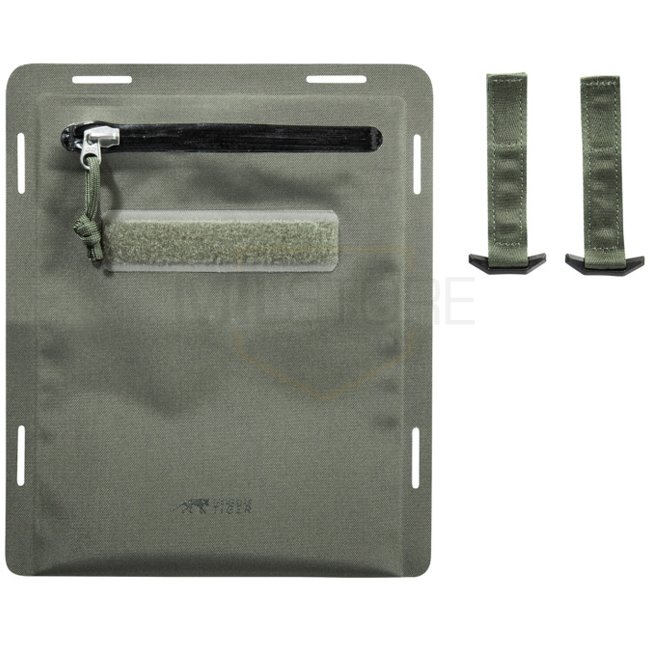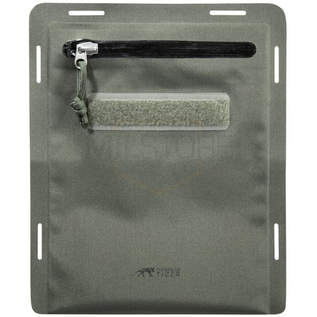 Pochette Tasmanian Tiger A5 WR - Olive Gris Pierre : Couverture de document résistante à l'eau avec adaptateur Molle-velcro. Nylon 420D TPU Eco. 26x22cm.