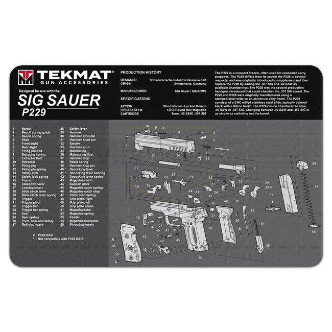 Tapis de nettoyage et de réparation TekMat très polyvalent pour SIG P229. Parfait pour l'entretien des armes, tout en étant idéal comme tapis de travail ou accessoire de bureau. Conception mince avec une épaisseur de 3 mm, mesurant 43 x 28 cm.