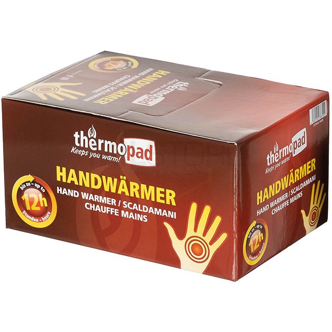 Chauffe-main Thermopad : Chauffe jusqu'à environ 12h, température jusqu'à environ 68°C, activé par l'oxygène. À jeter avec les déchets résiduels. Dimensions : 9 x 5,5 cm. Contient de la poudre de fer, du sel, du charbon actif, de l'eau, de la vermiculite.