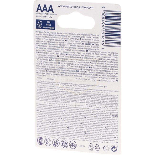 Piles rechargeables Varta AAA, capacité de 800mAh, pack de 4 pièces. Source d'alimentation fiable pour divers appareils.