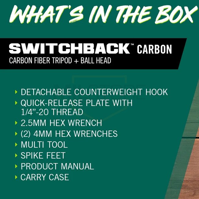 Conçu pour les chasseurs de l'arrière-pays et les tireurs de compétition qui ont besoin d'une plate-forme compacte mais super stable pour le tir de précision et le verre. Le Vortex Switchback™ Carbon Tripod prend en charge les fusils et les optiques lourds, offrant une installation rapide et une adaptabilité dans n'importe quel environnement, que vous soyez assis, à genoux, debout ou couché. Caractéristiques: • Rotule verrouillable • Trois sections de jambe • Verrouillages de pivot de jambe à 3 angles • Crochet de contrepoids amovible • Verrouillages de jambe à rotation • Pieds en caoutchouc (pieds à pointes inclus) Spécifications: Poids : 2 087 g Monture de tête: Arca-Swiss Charge maximale: 20 kg Hauteur minimale: 15 cm Hauteur maximale: 165 cm Sections de jambe: 3 Matériau de jambe: fibre de carbone Dimensions (Plié): 74 x 10 cm