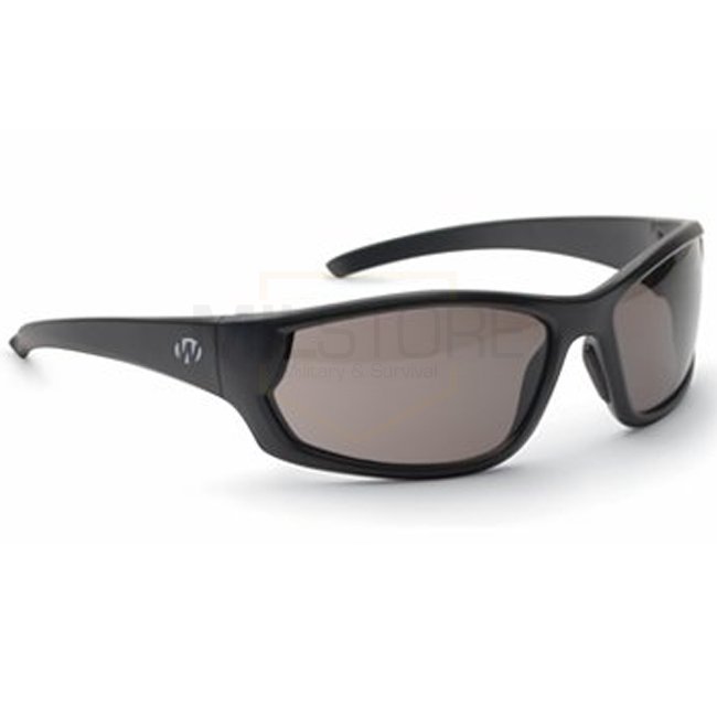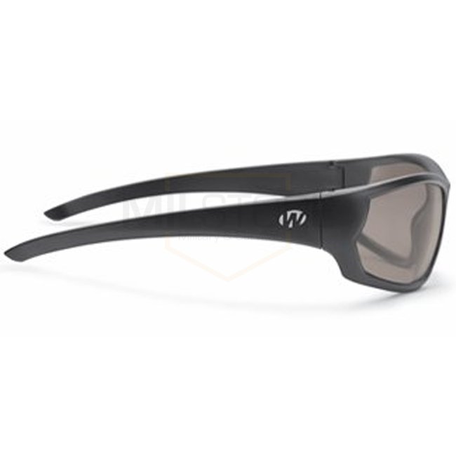 Lunettes de tir Walkers IKON Vector en fumée avec design à monture pleine, résistance aux impacts et conformité ANSI Z87.1-2010. Comprend une monture en caoutchouc noir mat, des branches en caoutchouc TPR Flex, un support nasal en mousse EVA, des boucles