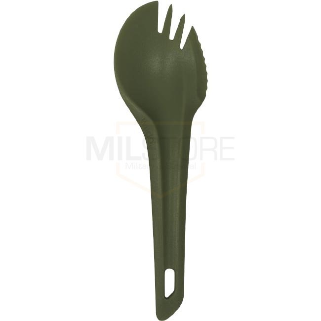 Kit de couverts compact et ergonomique, combinant fourchette, couteau et cuillère dans un design léger vert olive. Fabriqué en plastique durable. Idéal pour les activités de plein air.