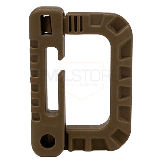 Attachez en toute sécurité l'équipement avec le mousqueton en plastique Woojin - Coyote. Ne convient pas pour l'escalade ou les missions de sauvetage !