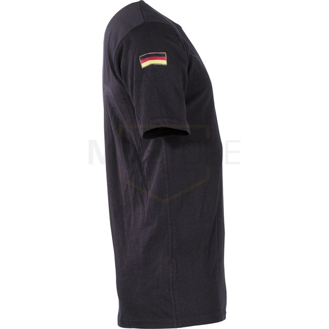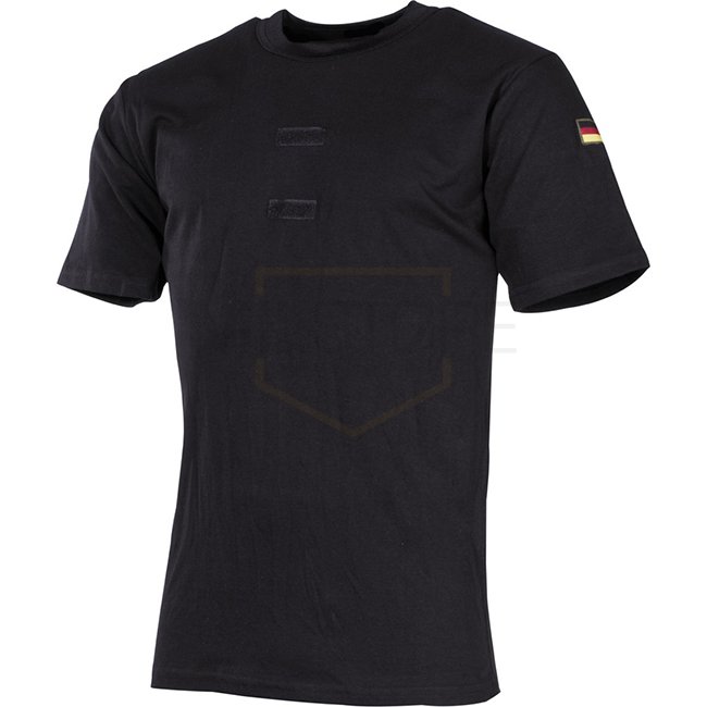 Kurzarmunterhemd in schwarzer Farbe mit einer speziellen Materialmischung für Komfort und Atmungsaktivität. Verfügt über eine extra robuste Seitennaht, 2 Klettverschluss-Panele auf der Brust und Nationalitätsabzeichen an beiden Ärmeln. Material: 60% Baumw