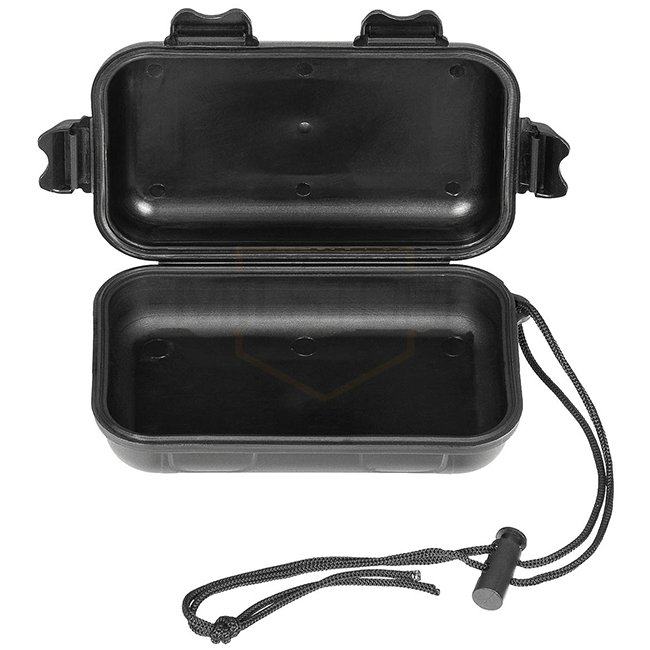 Kompakte und robuste MFH Kunststoffbox klein in eleganter schwarzer Farbe. Ausgestattet mit einem stoßfesten Kunststoffdeckel mit Gummiverschluss, 4 Schnappschlössern und einem praktischen Tragegurt. Äußere Abmessungen ungefähr 13,5 x 8 x 3,7 cm. Innere A