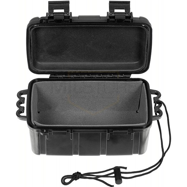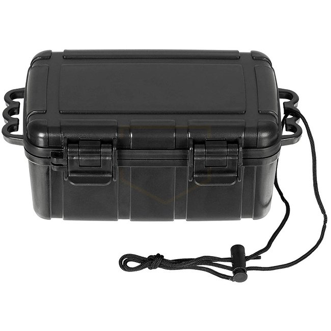 Schlagfester Kunststoff Deckel mit Gummidichtung 2 Schnappverschlüsse 1 Absperröse 2 kleine Griffe seitlich innen mit leichtem Schaumstoff ausgepolstert Trageband mit Kordelstopper aussenMasse: ca. 20 x 11,5 x 8,5 cm InnenMasse: ca 15,5 x 8,5 x 6,5 cm Gewicht: ca. 320 g