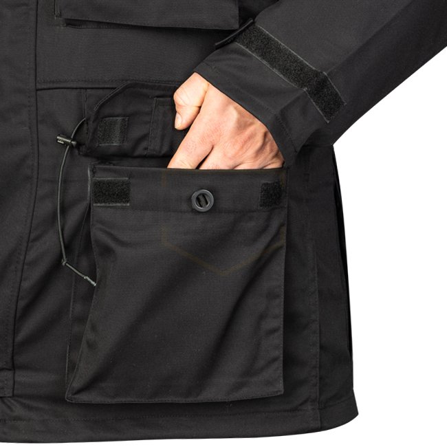 • Oberarmtaschen: Zwei Taschen an den Oberarmen, zugänglich über obere Klappen oder seitliche Reißverschlüsse, mit Klett zum Anbringen von Patches.