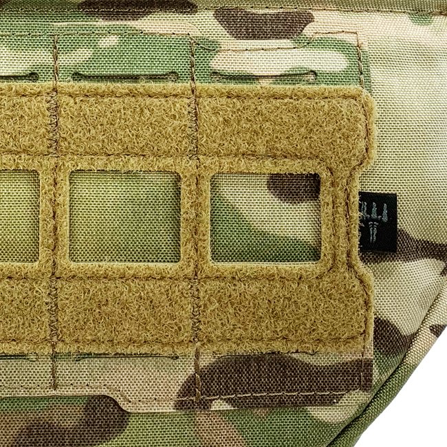Die Fronttasche weist auf der Innenseite Klett auf, damit zusätzliches Zubehör wie ein Organizer für Kleinmaterial oder ein Holster installiert werden kann. Die Laser-Cut MOLLE Schlaufen auf der Front dienen der Montage von zusätzlichen Taschen, was vor allem dann interessant ist, wenn die Drop Fanny Protector Pouch nicht zugänglich ist, etwa aufgrund von herausstehenden Magazintaschen am Plattenträger. Die MOLLE Schlaufen weisen aber auch eine Klett-Oberfläche für die Montage von Erkennungs-Patches auf. Da die mittleren Stege zudem nicht mit der Tasche vernäht sind, können auch Tourniquet Halter sicher eingeschlauft werden.