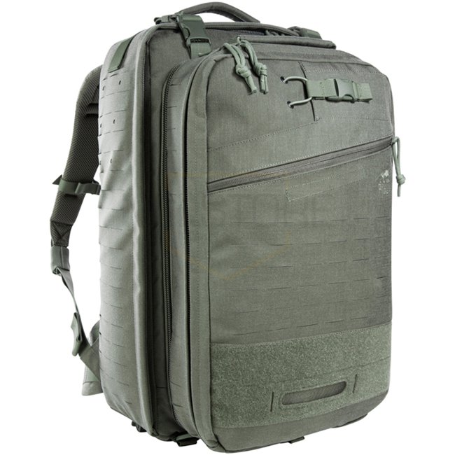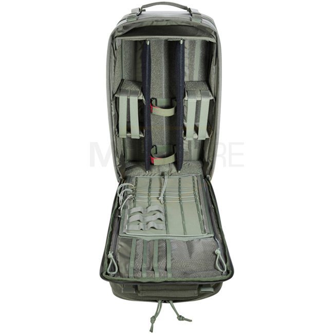 Das System bietet zwei in einem: der Frontrucksack kann abgenommen und separat getragen werden, wodurch maximale Flexibilität entsteht. Innen sorgen verstellbare Klett-Partitionen für individuelle Organisation, beispielsweise zur Aufnahme einer 2 l Sauerstoffflasche Ø 100 mm, Länge 430 mm. Laser-cut MOLLE System an Front und Seiten ermöglicht modulare Erweiterung.