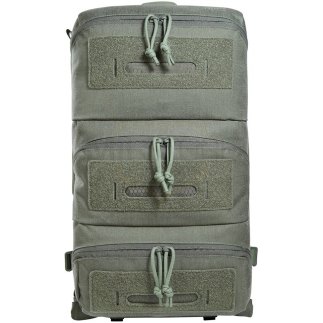 - MOLLE-Flächen intern für modulare Erweiterung; drei Fronttaschen mit verschiedenen Innenaufteilungen und Klettflächen zur Beschriftung