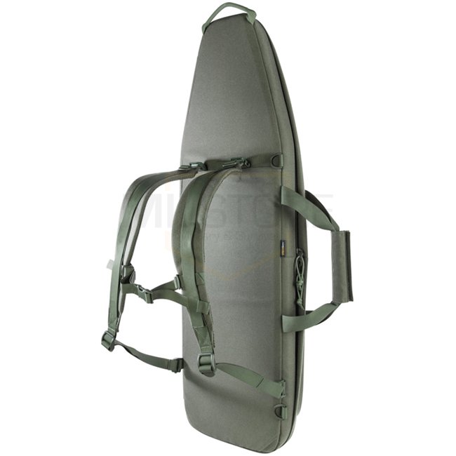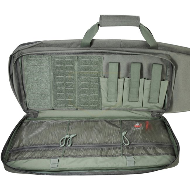 Diese gepolsterte Waffentasche ist für Mitteldistanzwaffen bis zu 95 cm Länge und 26 cm Höhe ausgelegt und bietet ein Waffenfach sowie eine grosse Außentasche mit drei fest vernähten Magazintaschen, MOLLE-Klettflächen zur individuellen Bestückung und eine Reissverschluss-Netztasche.
